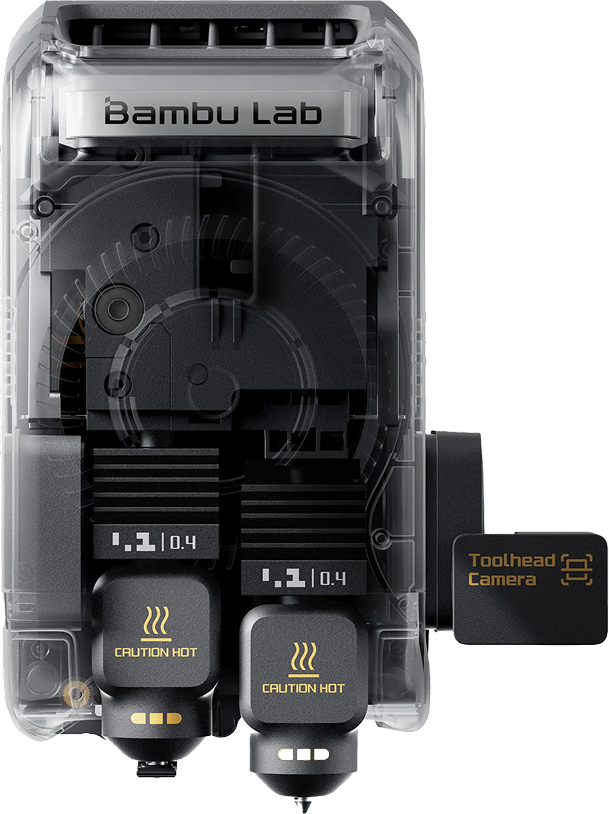 モーターはプリンターの背面に取り付けられ、フィラメントをPTFEチューブを通してツールヘッドに送り込みます。サポート材や多色印刷向けに設計されています。ノズル切り替えは高速で、長時間のパージサイクルなしで瞬時に色を切り替えることができます。PVA溶解性サポート材、PETG/PLA向けのブレークアウェイインターフェース、そしてAMSと組み合わせることで最大25色印刷が可能になります。