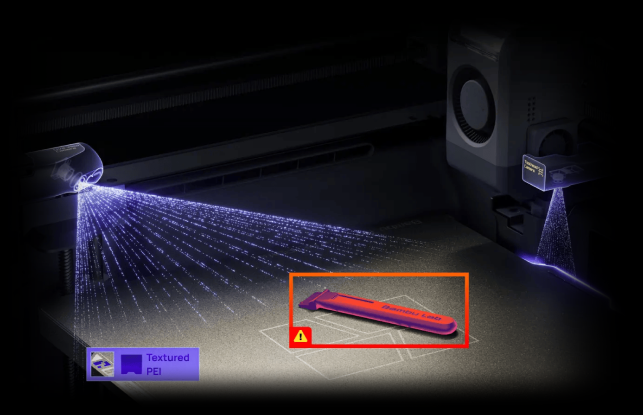 "造形前:ビルドプレート上の異物をスキャン、スライサーの設定とプレートの種類を照合します。 印刷中:スパゲッティ現象などの造形不良、ノズル詰まり、パージシュートの詰まりを監視し、不具合が悪化する前に自動的に造形を一時停止します。タイムラプス撮影に対応。チャンバー照明のアップグレードにより、Bambu Handyによるリモート監視機能が向上しました。"