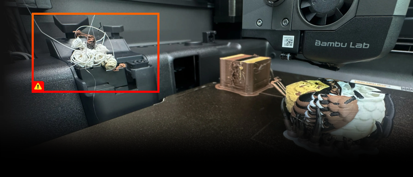 センサーがフィラメントのスプールからノズルまでの経路全体を監視します。フィラメント切れ、摩耗、絡まり、電源喪失などの事象が発生すると、それぞれ自動的に保護機能が作動し、造形中のパーツを保護します。
