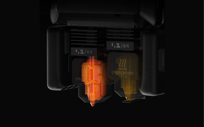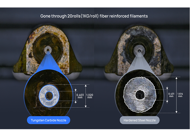 Bambu Lab H2D Proで使用されているタングステンを複合したカーバイドノズルは、硬化鋼よりも50%以上耐久性が高く、炭素繊維(CF)やガラス繊維(GF)などの研磨性の高い繊維強化素材による摩耗にも耐性があります。メンテナンスの頻度が下がり、より長く造形に耐えられます。