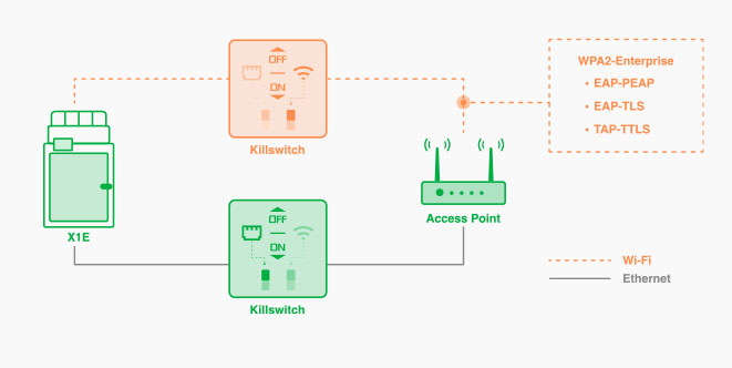 X1Eは、新たに追加されたイーサネットポートを介してデバイスに接続するオプションがあり、複雑な環境でも堅牢なネットワーク通信を実現します。イーサネット接続は、混雑した無線信号環境でも使用できます。さらにX1Eは、WPA2-Enterprise Wi-Fi認証(EAP-PEAP/EAP-TLS/TAP-TTLS)と、Wi-Fiとイーサネットの両方に個別のキルスイッチを備えており、厳しいネットワークセキュリティ要件に対応しています。