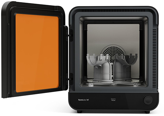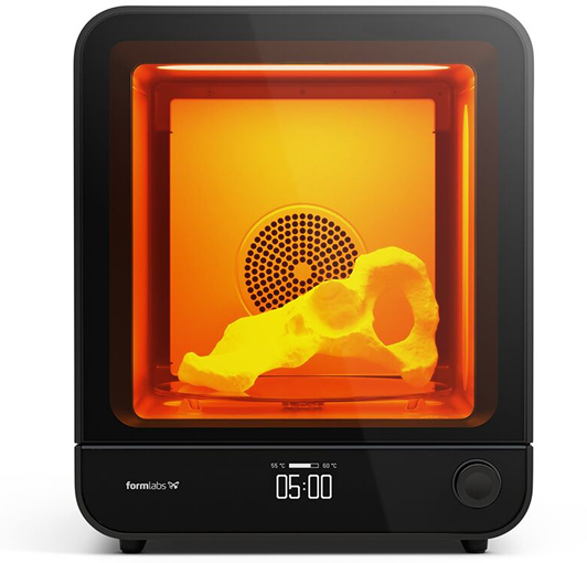Form Cureは、造形と洗浄を終えたモデルの硬化処理を自動で行う機械で、モデルの強度と性能を向上させます。洗浄後、モデルをForm Cureにセットし、扉を閉めてモデルの材質を選択すると、温度と硬化時間を自動で設定して硬化処理を行います。新しくなったForm Cureは硬化処理のサイクルをほとんどのケースでわずか1分という速さで硬化処理をスタートできます。