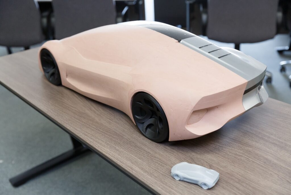 データ立体検証に3Dプリントしたモデル(手前)を利用してデザインを追求し、制作されたクレイモデル