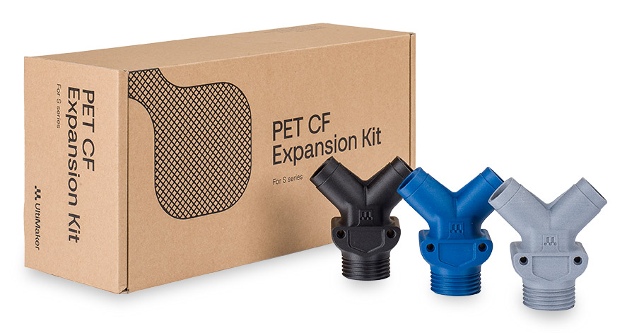 PET CF拡張キットには、UltiMaker Sシリーズプリンターで高性能パーツの印刷を開始するために必要なすべてのものが含まれており、UltiMakerプラットフォームのシームレスなワークフローと使いやすさを組み合わせて、炭素繊維複合パーツのフルパワーを得ることができます。