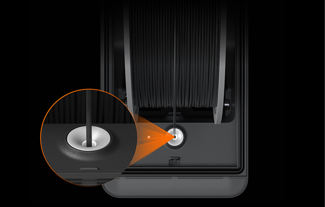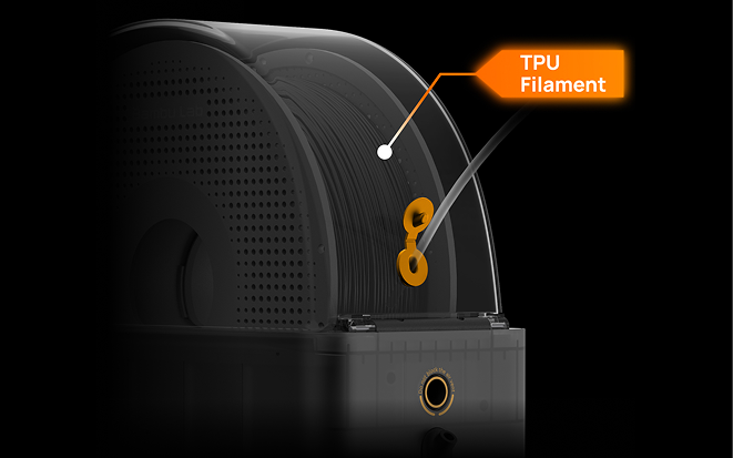 トップカバー背面のポートはTPUフィラメント専用です。TPUフィラメントは柔らかいため、AMS 2 Proの自動供給機能を使用すると、フィラメントが詰まりやすくなります。TPUフィラメントを使用する場合は、AMS HTに挿入し、材料トレイが正しい方向に回転することを確認してください。材料チューブをTPU出力ポートに挿入し、PTFEチューブを通してフィラメントを手動で押し込み、エクストルーダーに完全に装填されるまで押し込んでください。TPU を使用する場合、AMS HT は自動フィーディング機能は使用できませんが、材料の湿気を防ぐための乾燥ボックスとして使用できます。AMS HT は、機械自体がフィラメントをフィードして造形している間は、フィラメントの乾燥を実行できません。