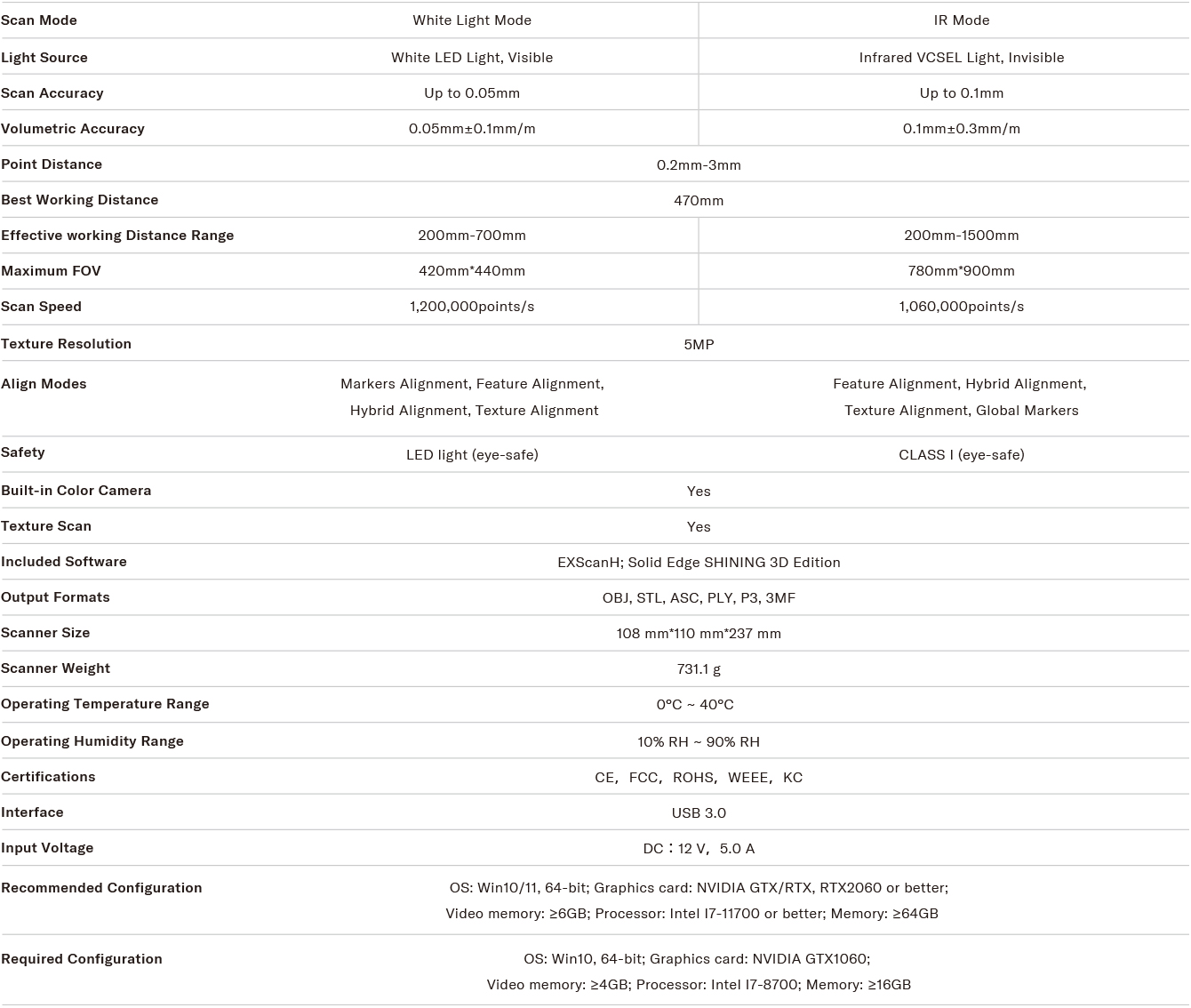 EinScan H2は、5MP解像度のテクスチャカメラを搭載し精度が向上しただけでなく、3つの赤外線VCSELプロジェクターにより、リアルな情景をとらえ高品質な造形を実現できるように改良しました。広いスキャンエリアと調整可能な稼働領域により、狭い場所でも広い場所でも、大小さまざまなシーンで対象物をとらえます。EinScan H2は効率的な3Dスキャンであり、日々の業務に革命をもたらします。