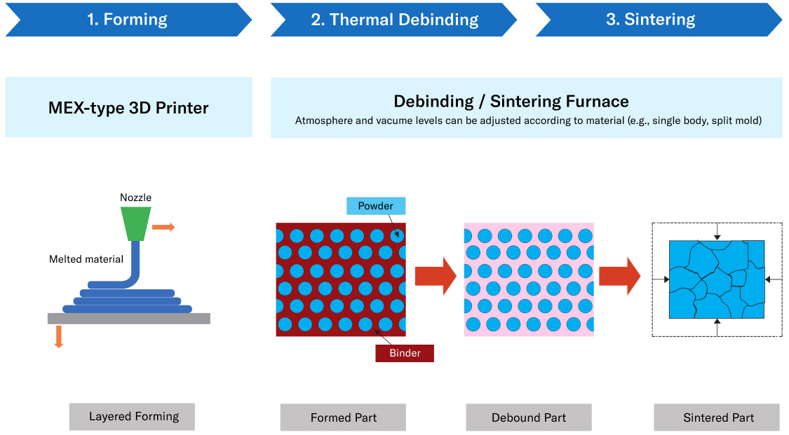Technology for producing metal and ceramic parts using MEX type 3D printers.